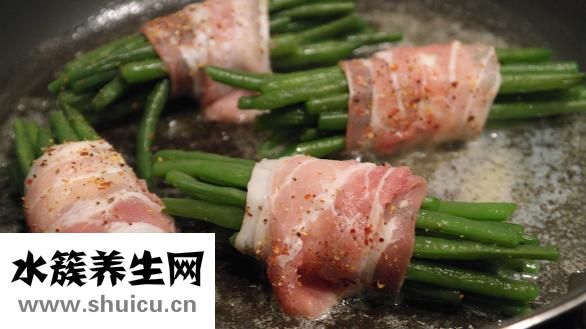 1.準(zhǔn)備一個耐高溫的容器,將培根切成1厘米的塊狀,荷蘭豆擇洗干凈后切成小段,蒜蓉切成蒜蓉備用。
